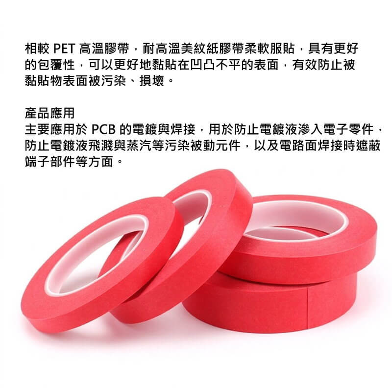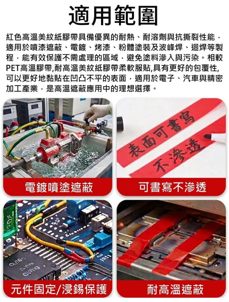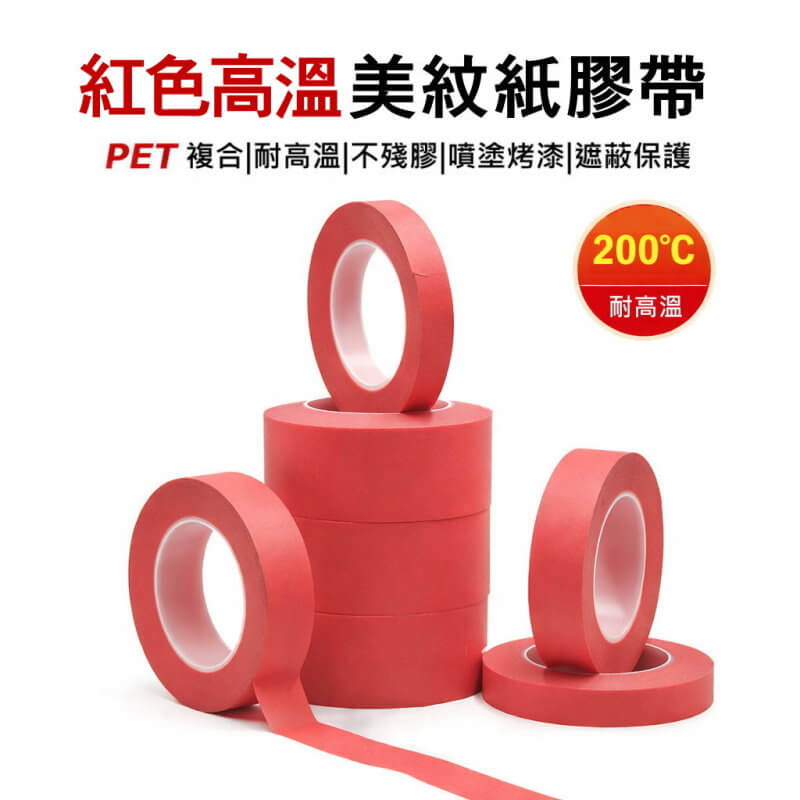 紅色高溫美紋紙膠帶一般可耐高溫約200°C~250°C,適用於烤漆、電鍍乾燥及PCB焊接等高溫製程,是標準的高溫遮蔽膠帶。