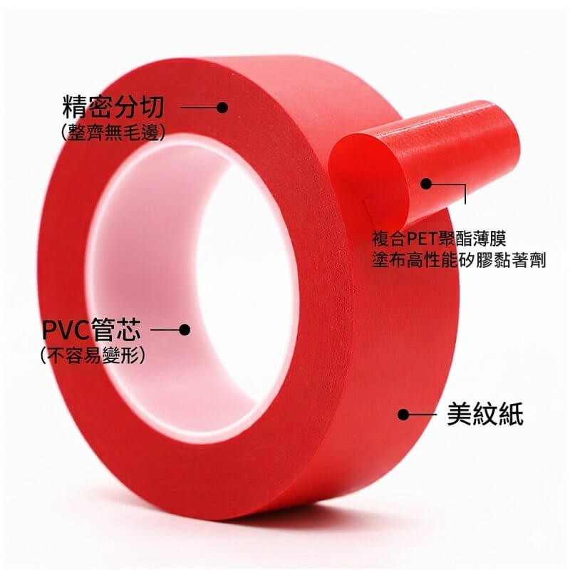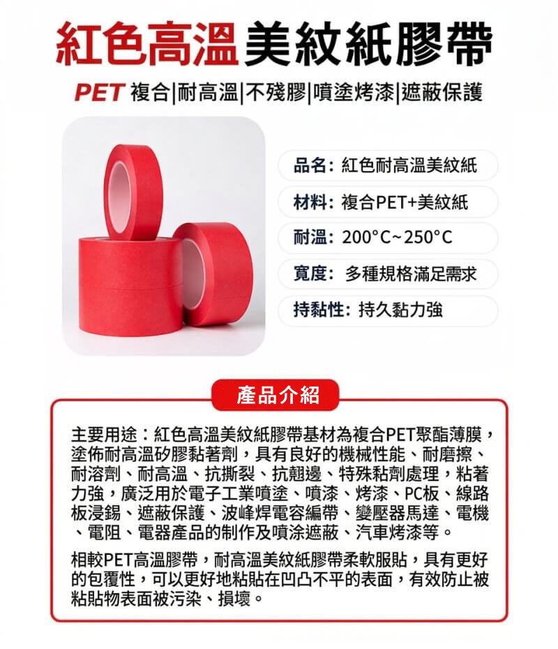 紅色高溫美紋紙膠帶是一種結合PET聚酯薄膜與美紋紙複合基材,並塗布耐高溫矽膠黏著劑製成的工業用遮蔽膠帶。