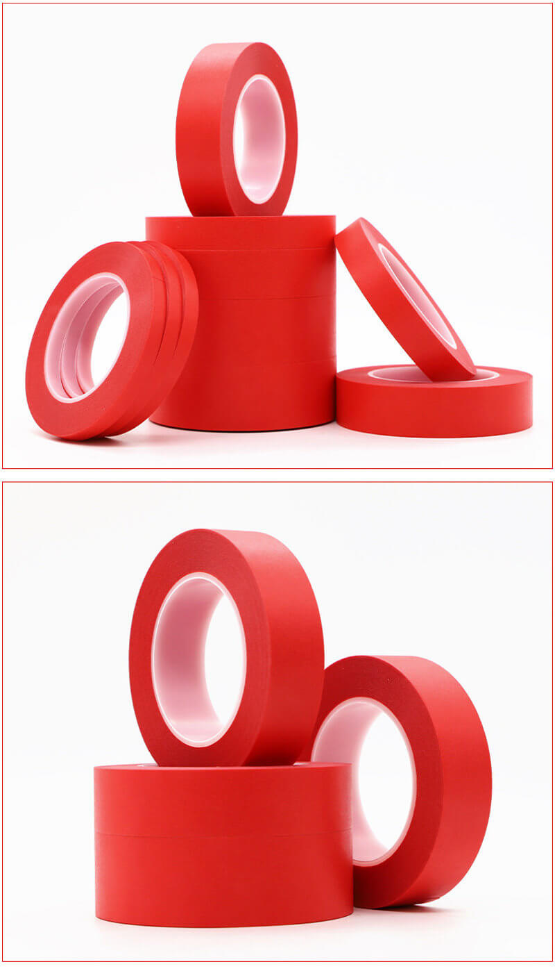 紅色高溫美紋紙膠帶專為高溫遮蔽設計,具備耐高溫、不殘膠、高服貼性等特性,是目前電鍍遮蔽膠帶與烤漆遮蔽膠帶的主流選擇。